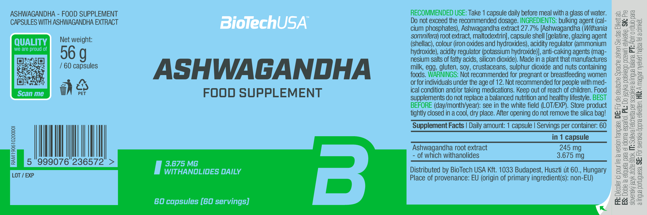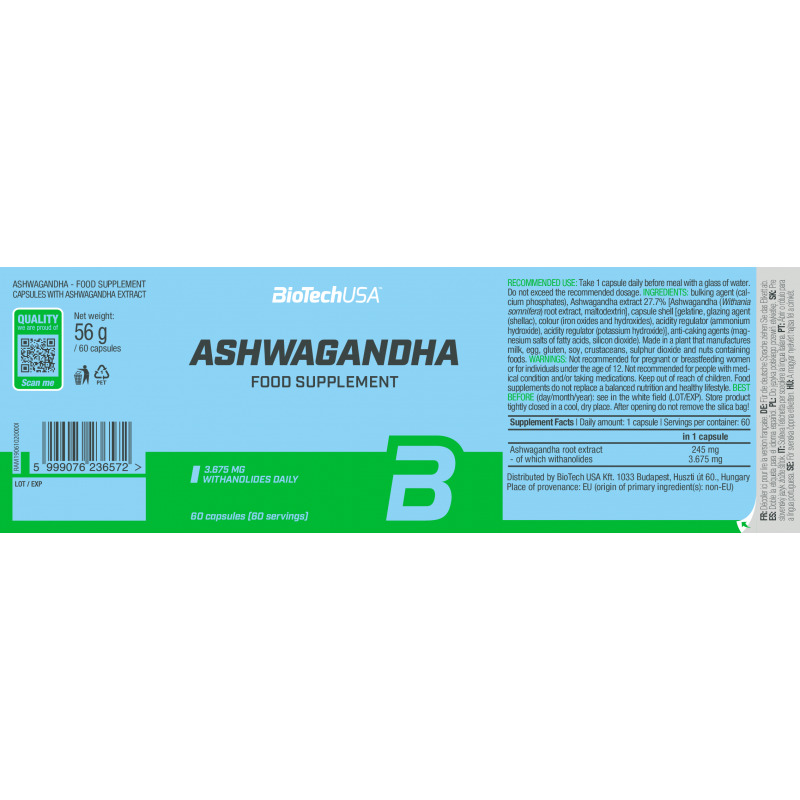 在日常生活中,這種植物的根與葉常以乾燥研磨的形式使用,甚至可加入奶昔或各種糊狀食物中。得益於膠囊形式,BioTechUSA Ashwagandha 使用方便,隨身攜帶毫不費力。只需一顆膠囊,就能攝取最佳劑量,輕鬆完成一個月的療程式補充。