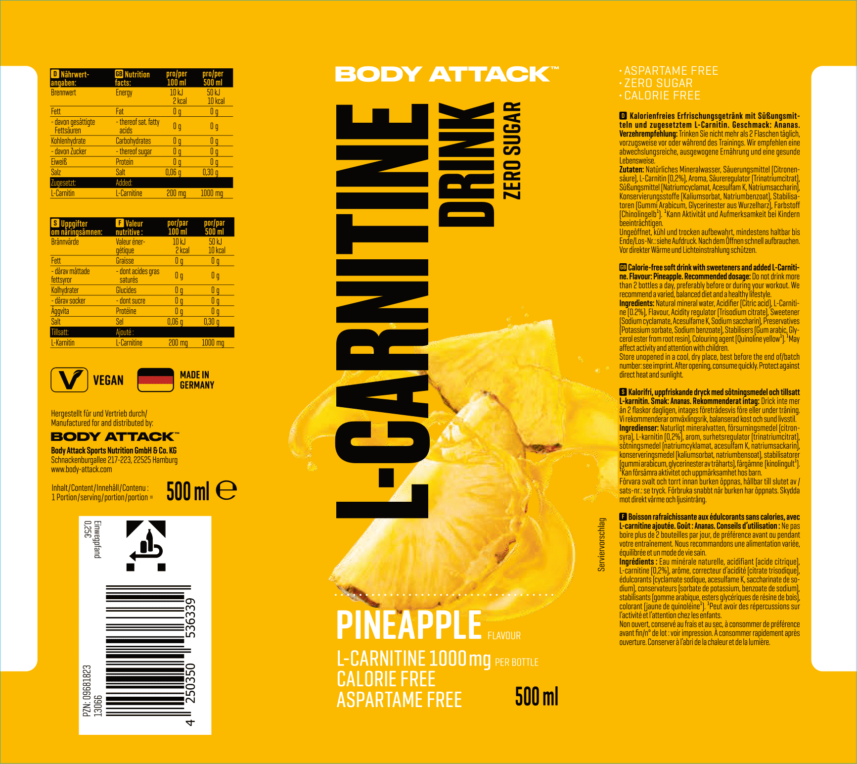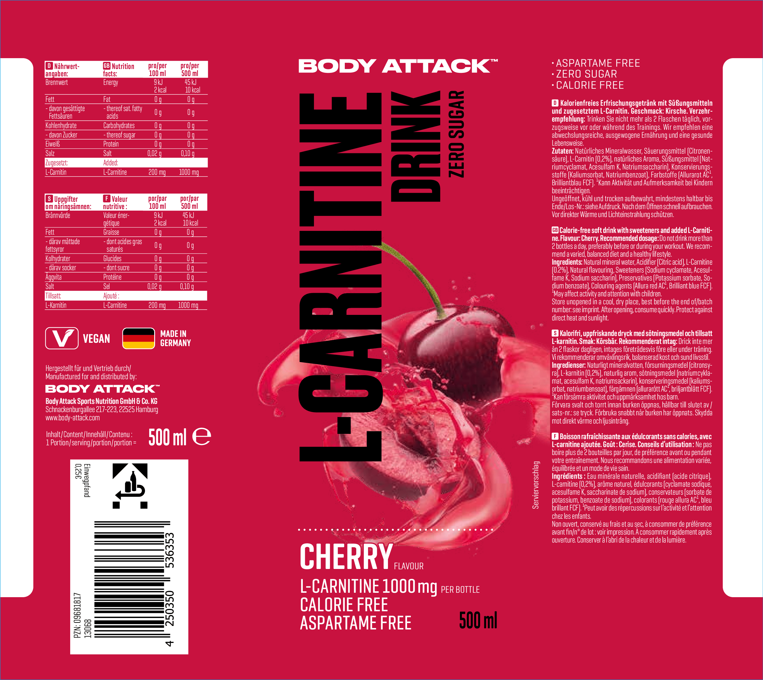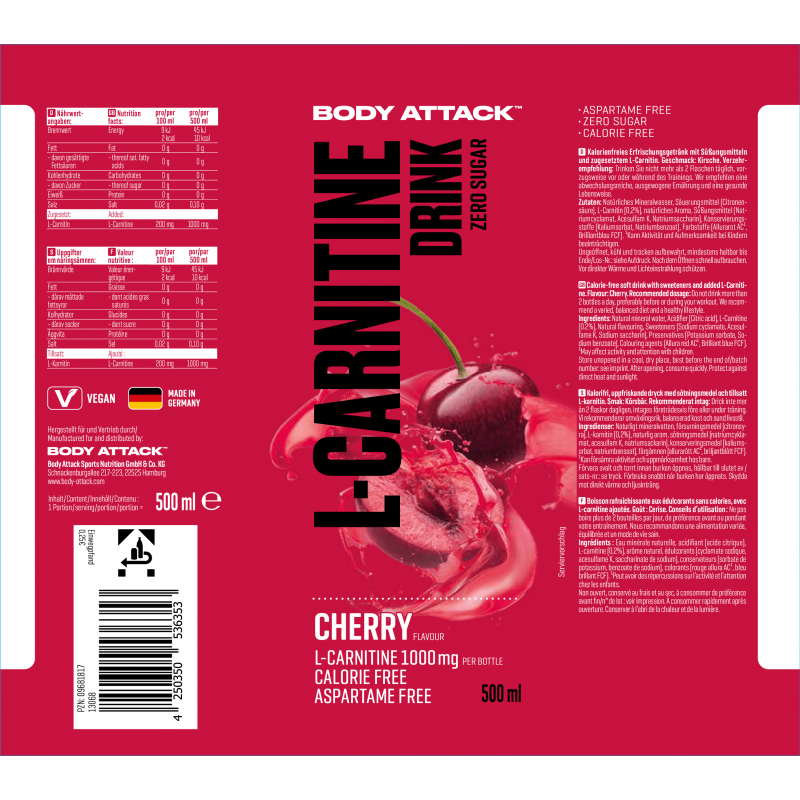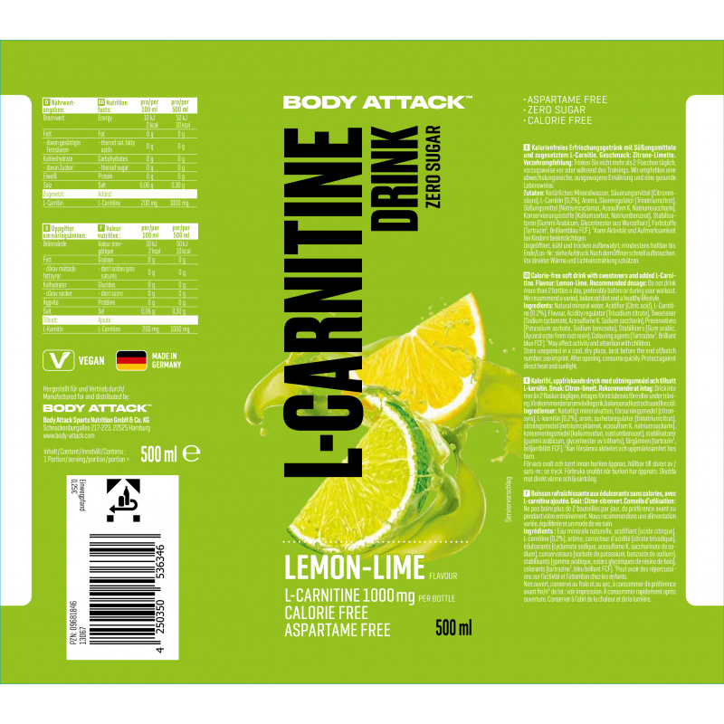 Body Attack左旋肉鹼(卡尼丁)飲料是一種由天然礦泉水製成的清涼飲料,幾乎不含卡路里(2.0大卡/ 100毫升)。