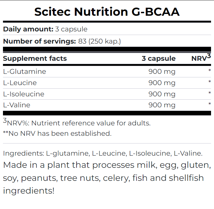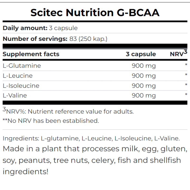 - 每粒含 1200 毫克膠氨酸(谷氨酰胺)、亮氨酸、異亮氨酸、 纈氨酸。
