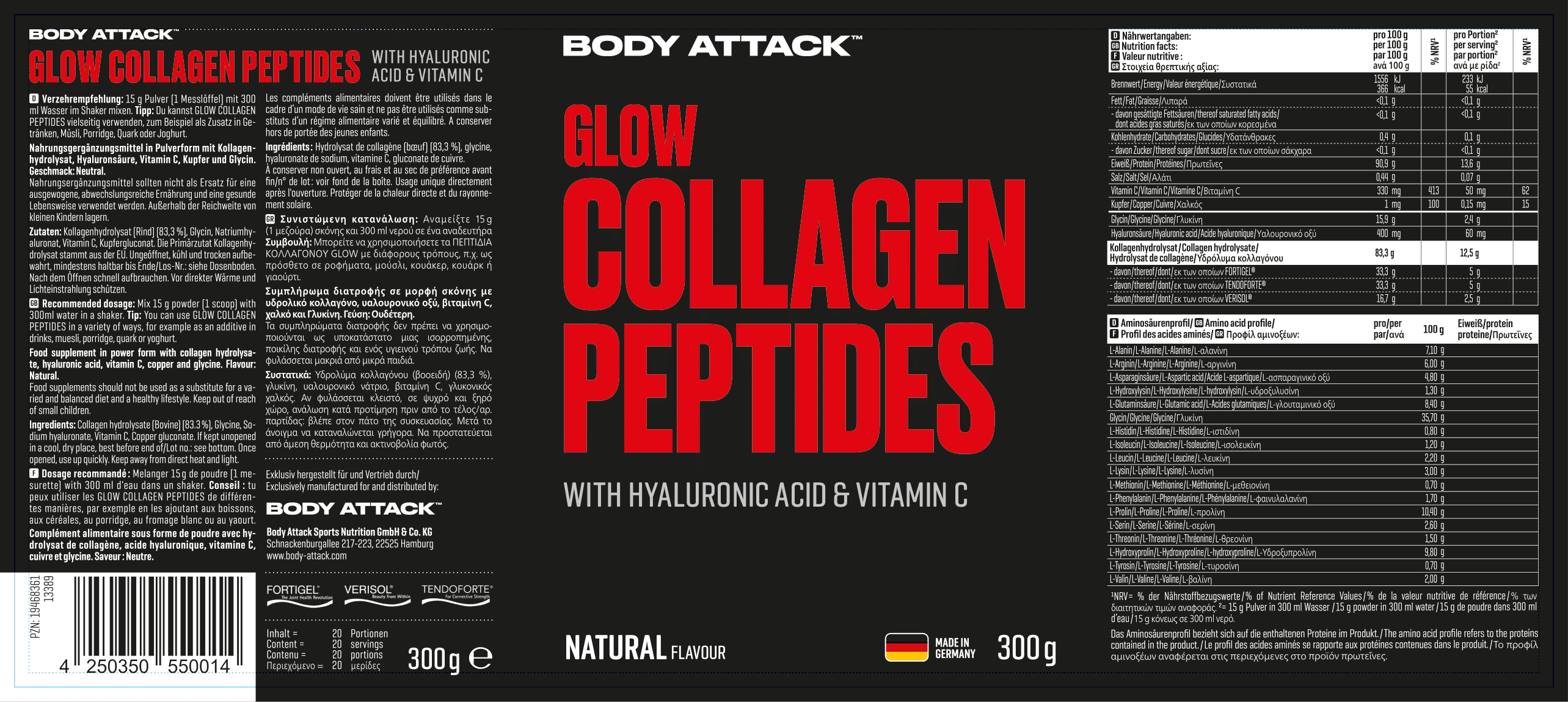 - 含三種不同的膠原蛋白肽:FORTIGEL®、TENDOFORTE®、VERISOL® 分別針對軟骨、肌腱和皮膚彈性問題