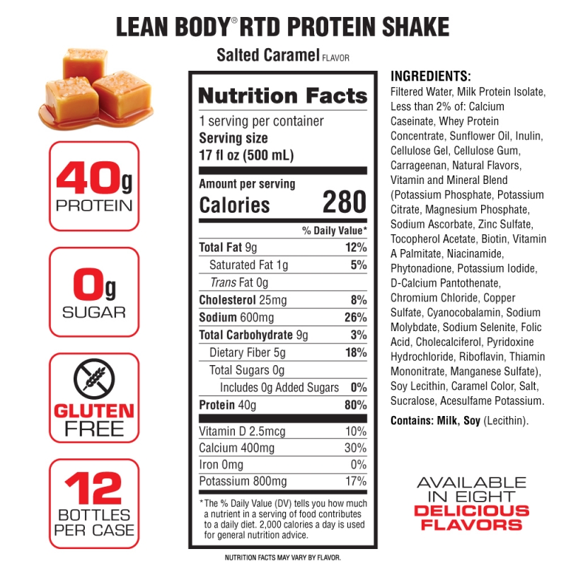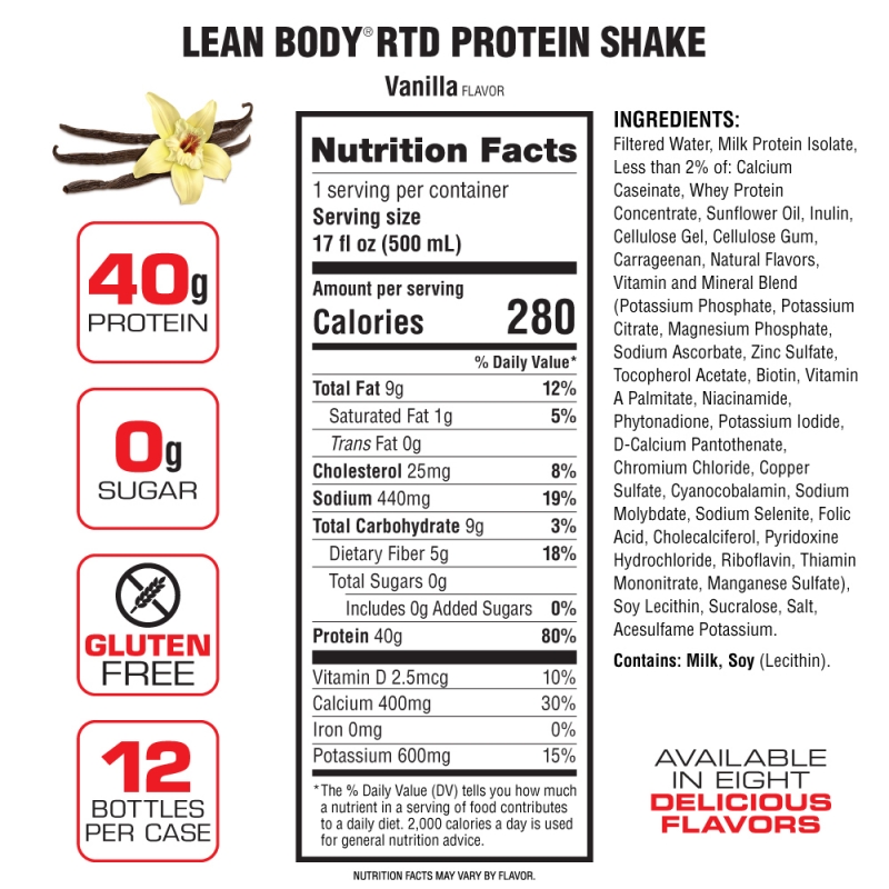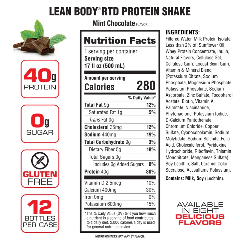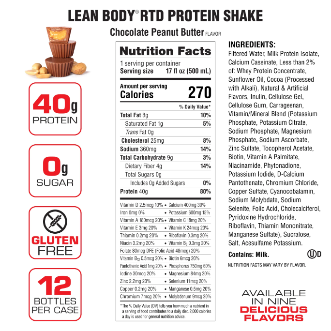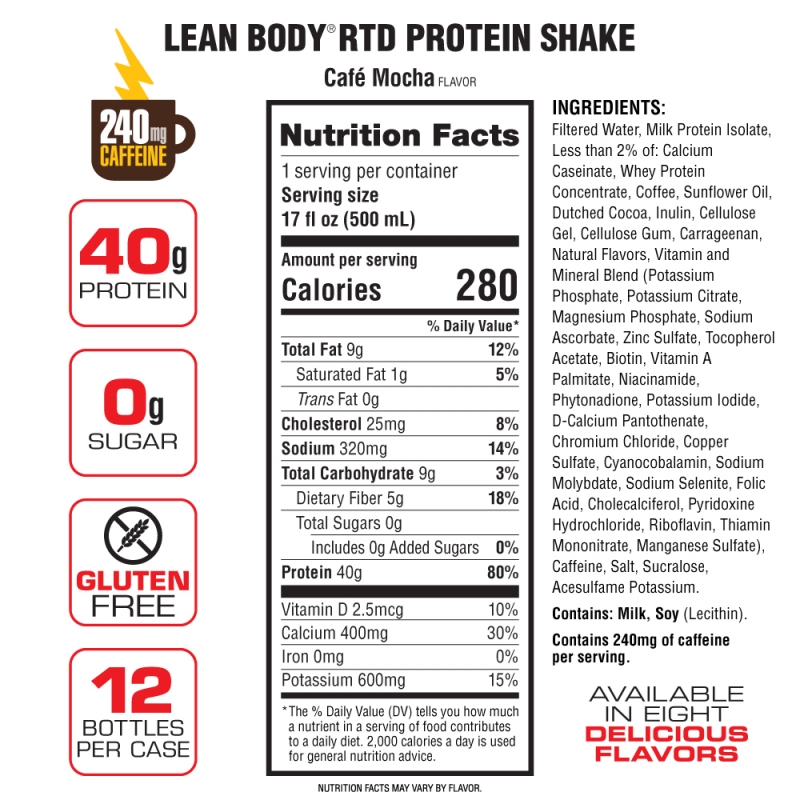 「Lean Body」代表著更健康的生活、更充沛的能量、更強壯的體魄,以及更佳的身心狀態。無論你的目標是什麼,Lean Body® 即飲高蛋白奶昔 (RTD Shakes) 都能幫助你達成。Lean Body® RTD提供高品質蛋白質,不含糖與麩質。每一口順滑、香濃的口感,為你的緊實肌肉提供營養支持,讓你每次都滿意。