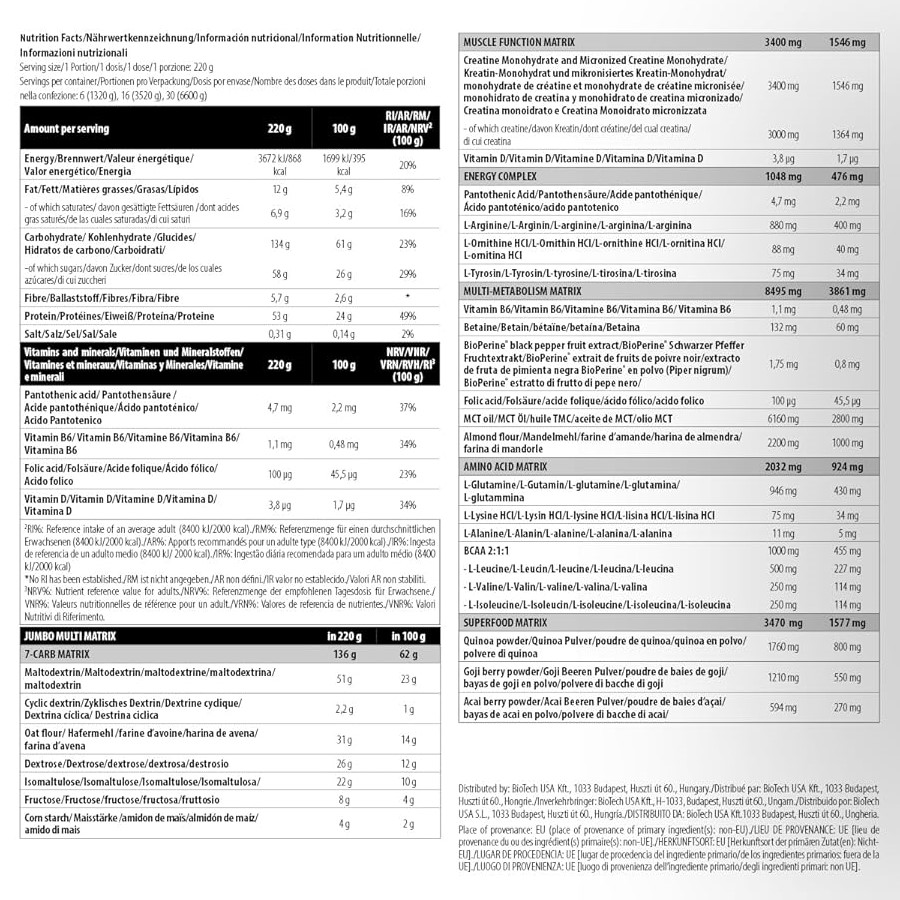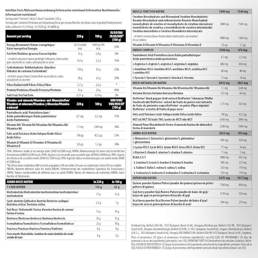 每份含高達884千卡,Jumbo不僅含有高含量優質蛋白質,配方中的三種快碳及三種慢碳成分,有助你身體於不同時間分段吸收更多營養,加快肌肉增長。