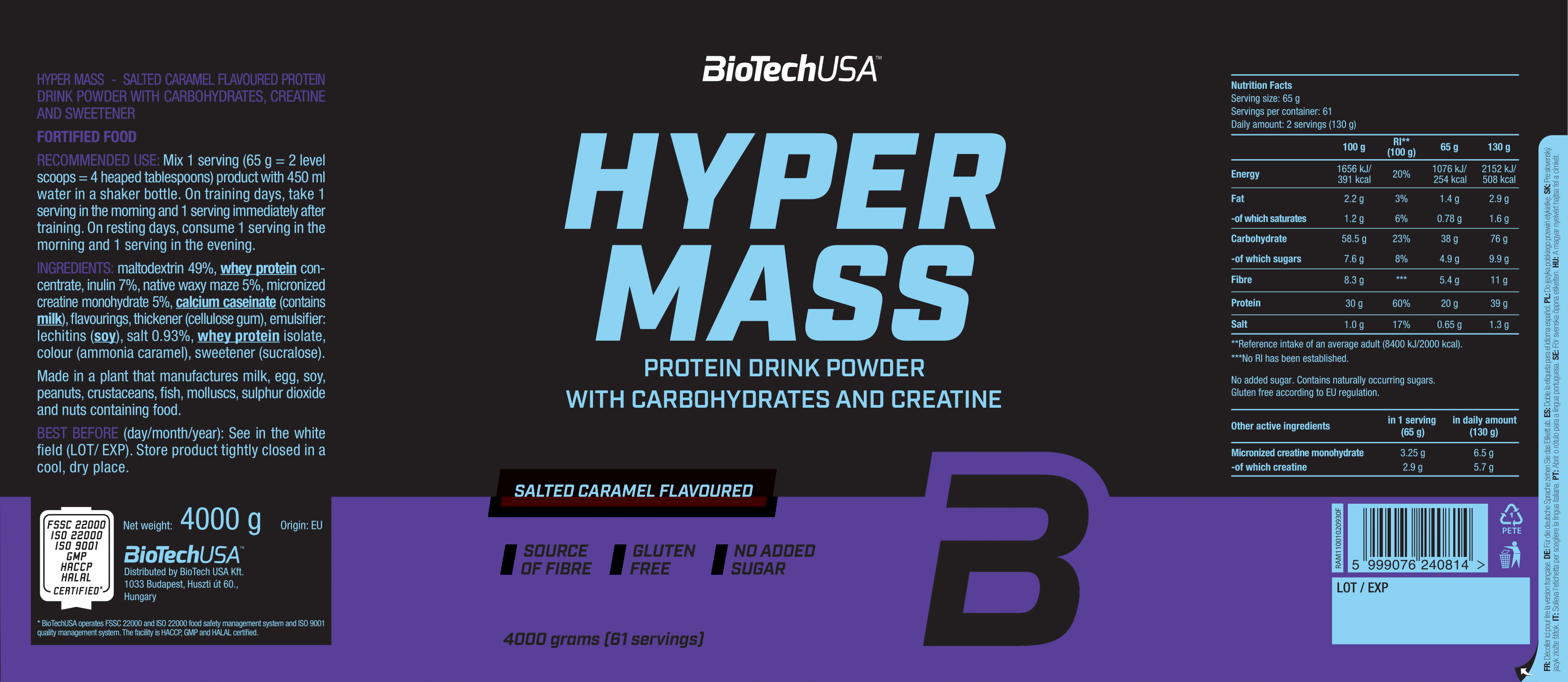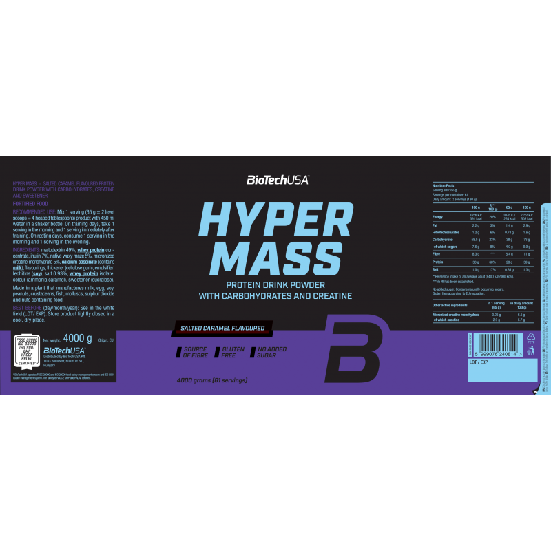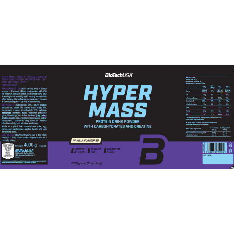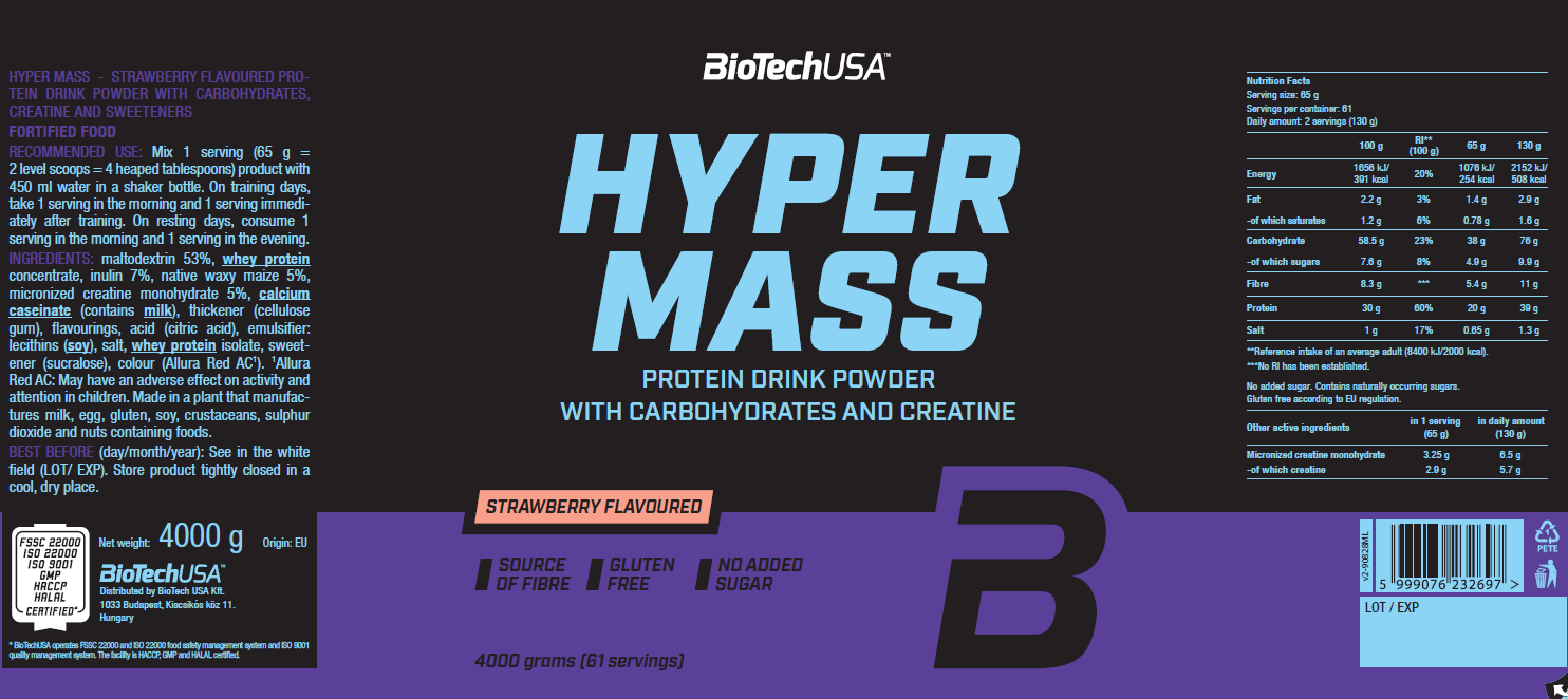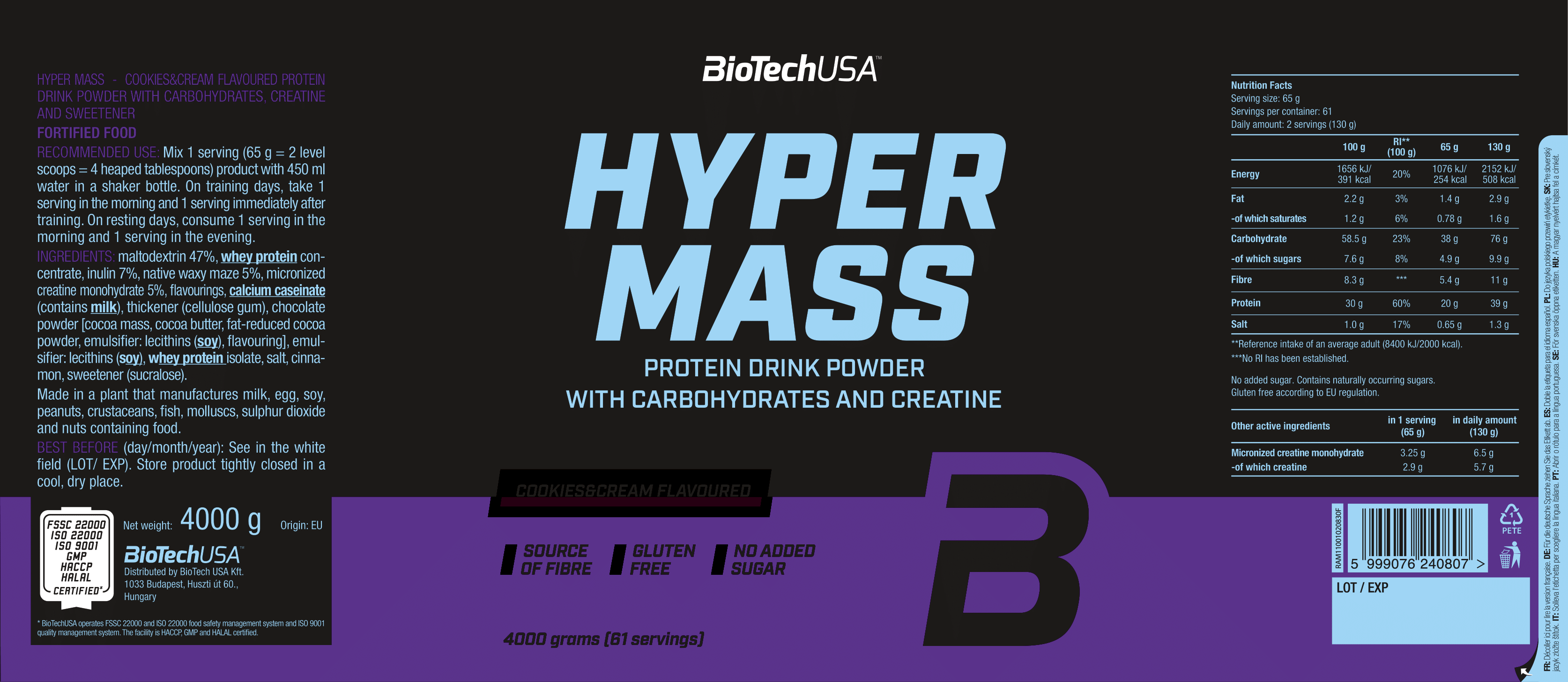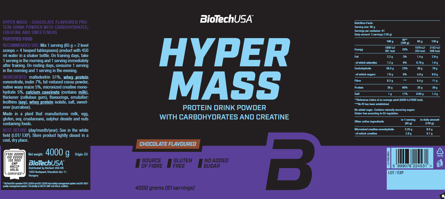 BioTechUSA Hyper Mass 是一款專為運動員、健美人士以及希望提升肌肉大小與力量的人士而設的增重粉。它精心搭配了碳水化合物、蛋白質、膳食纖維以及微粉化一水肌酸,為身體提供增長與恢復所需的額外熱量與營養。