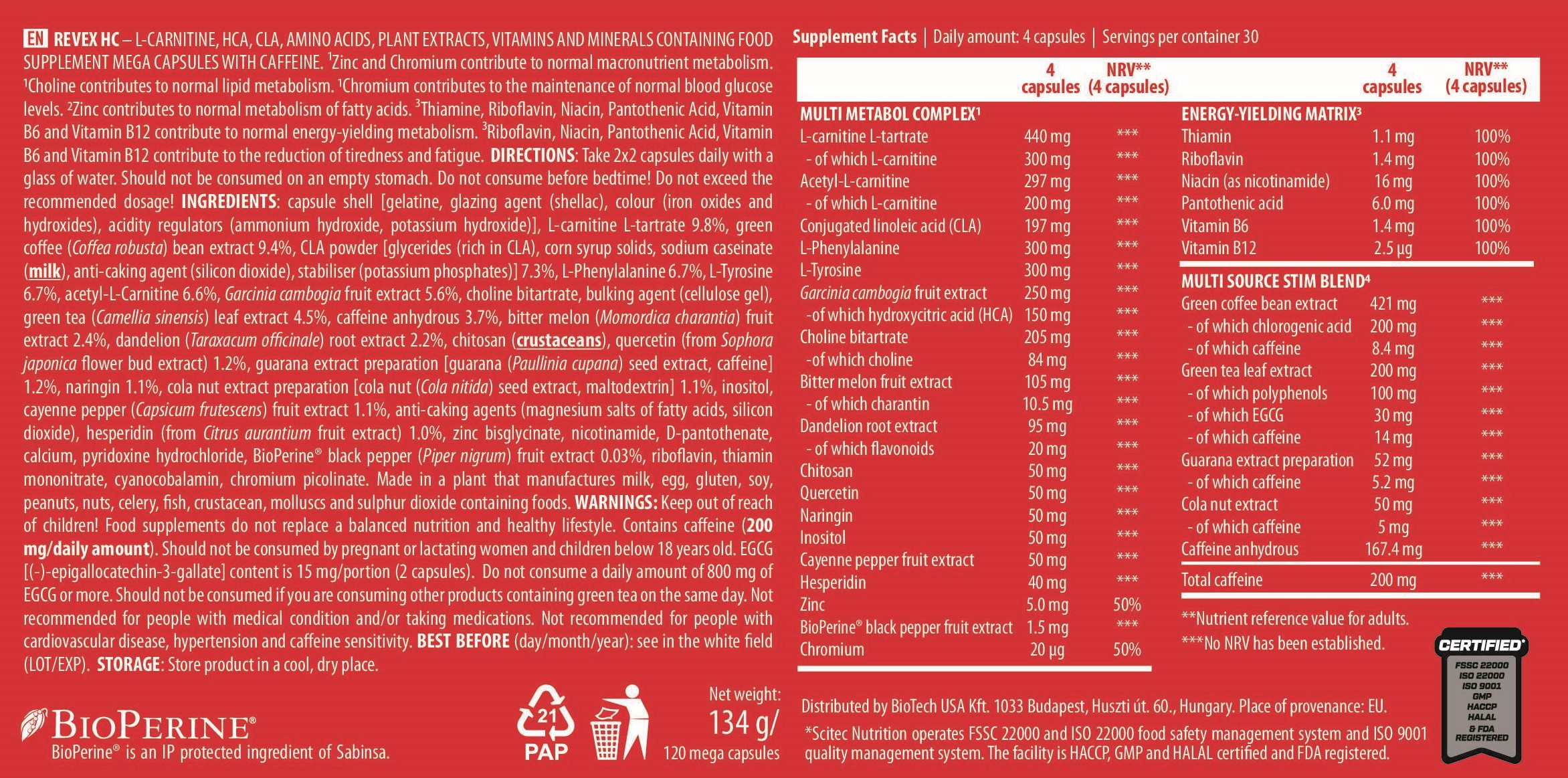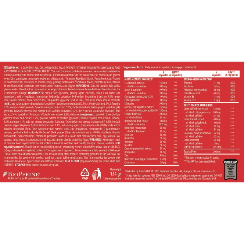 - 藤黃果萃取物羥基檸檬酸 (HCA)、 BioPerine ® 黑胡椒果實萃取物和 綠茶萃取物兒茶素 (EGCG)等