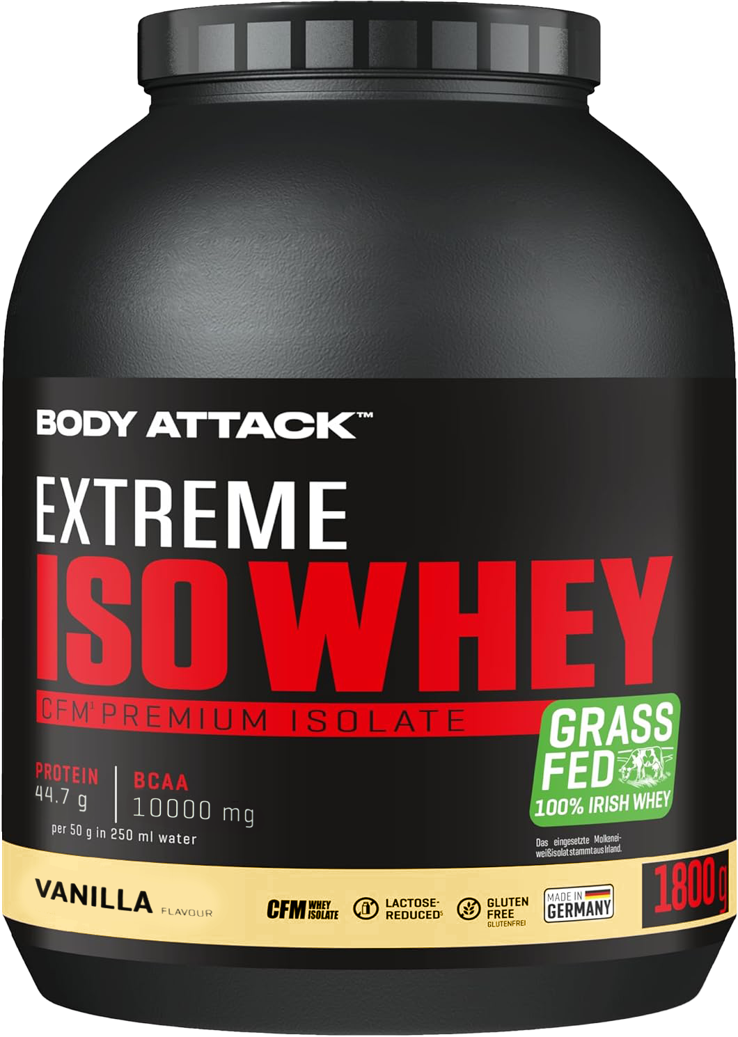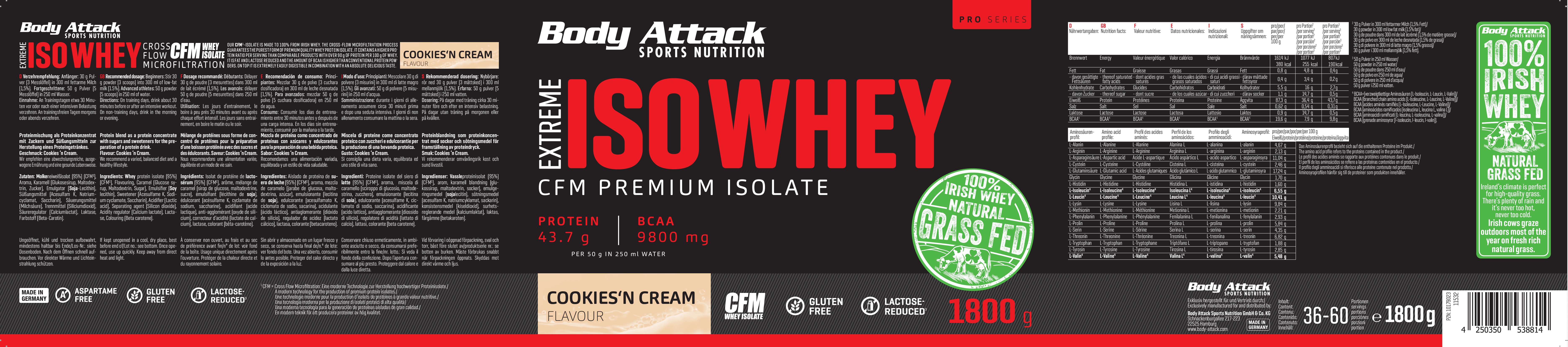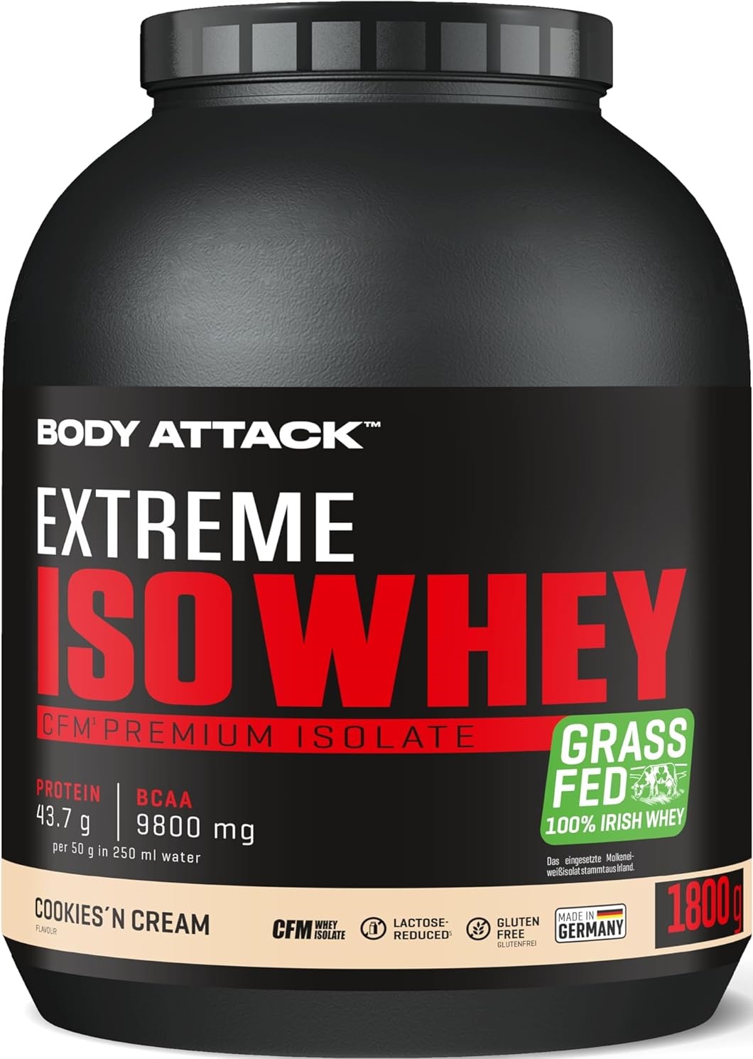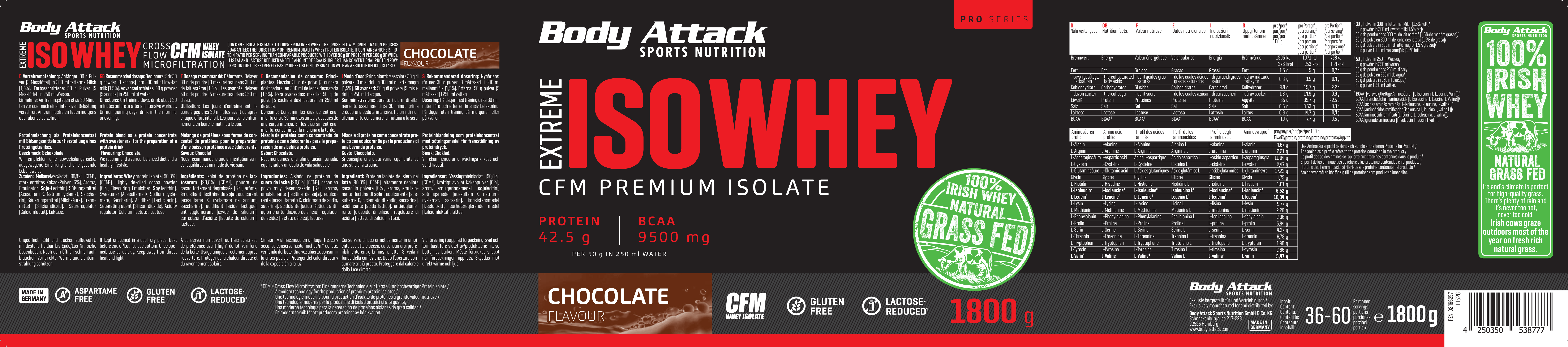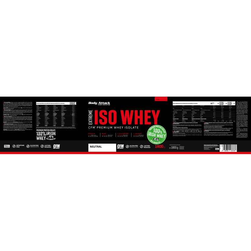 採用來自愛爾蘭真正牧場、草飼牛奶源的乳清蛋白,製造出最優質的蛋白奶昔。Body Attack Extreme Iso Whey 乳清蛋白粉的分離乳清比例超過 90%,製程溫和、低乳糖、不含阿斯巴甜,且極易消化吸收。