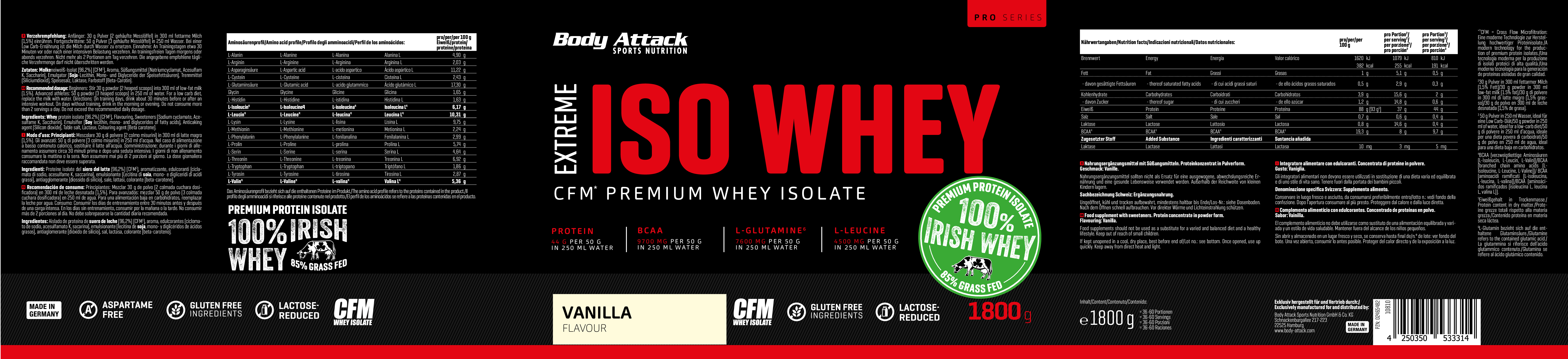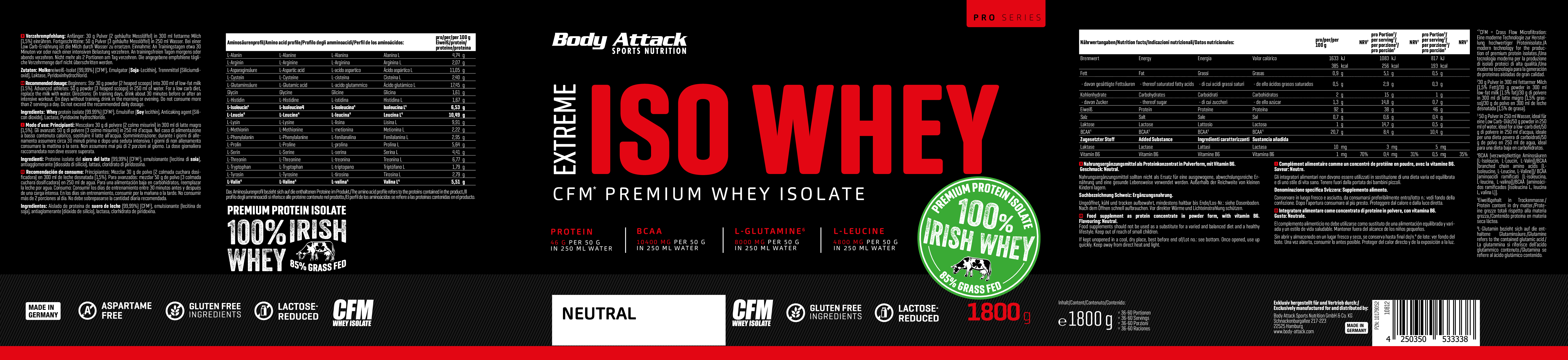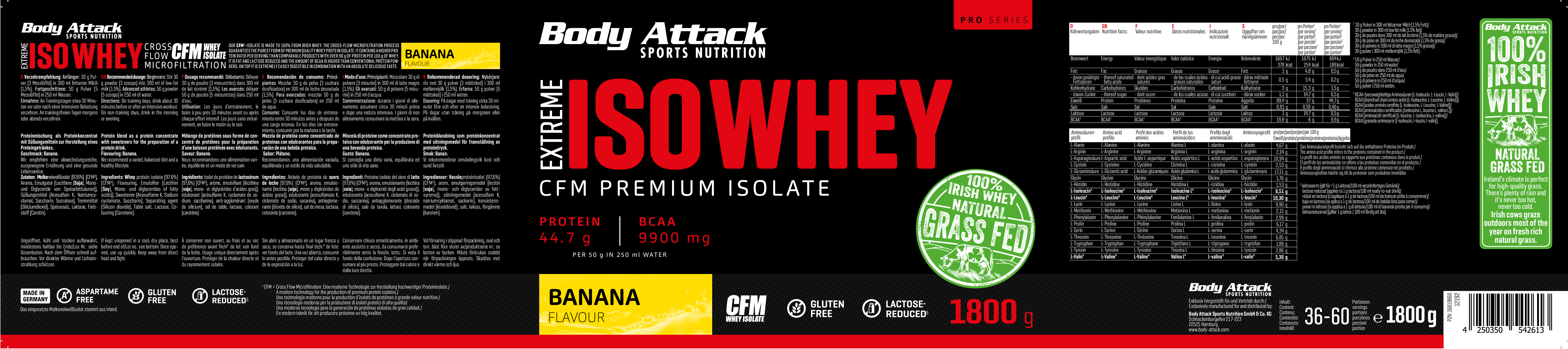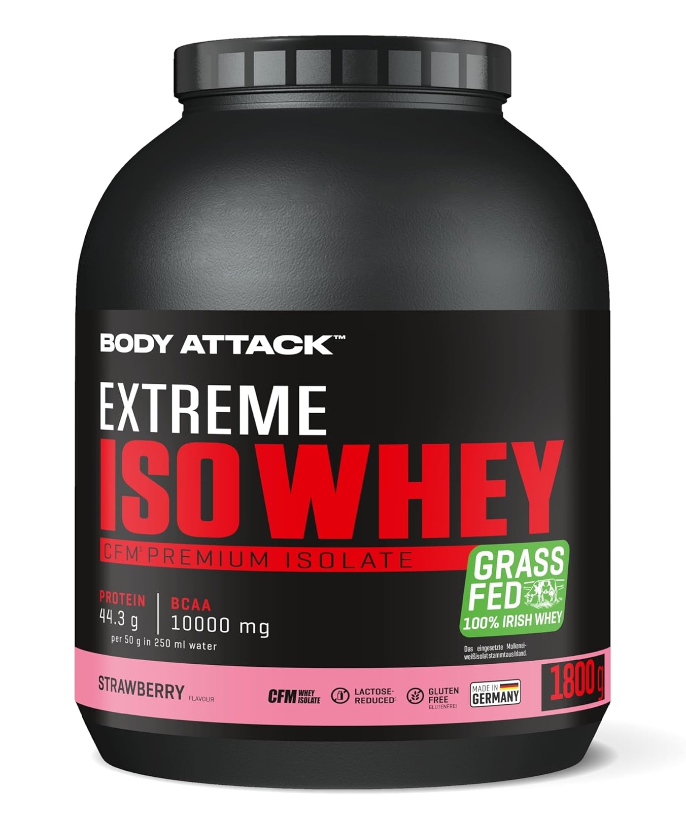 採用來自愛爾蘭真正牧場、草飼牛奶源的乳清蛋白,製造出最優質的蛋白奶昔。Body Attack Extreme Iso Whey 乳清蛋白粉的分離乳清比例超過 90%,製程溫和、低乳糖、不含阿斯巴甜,且極易消化吸收。
