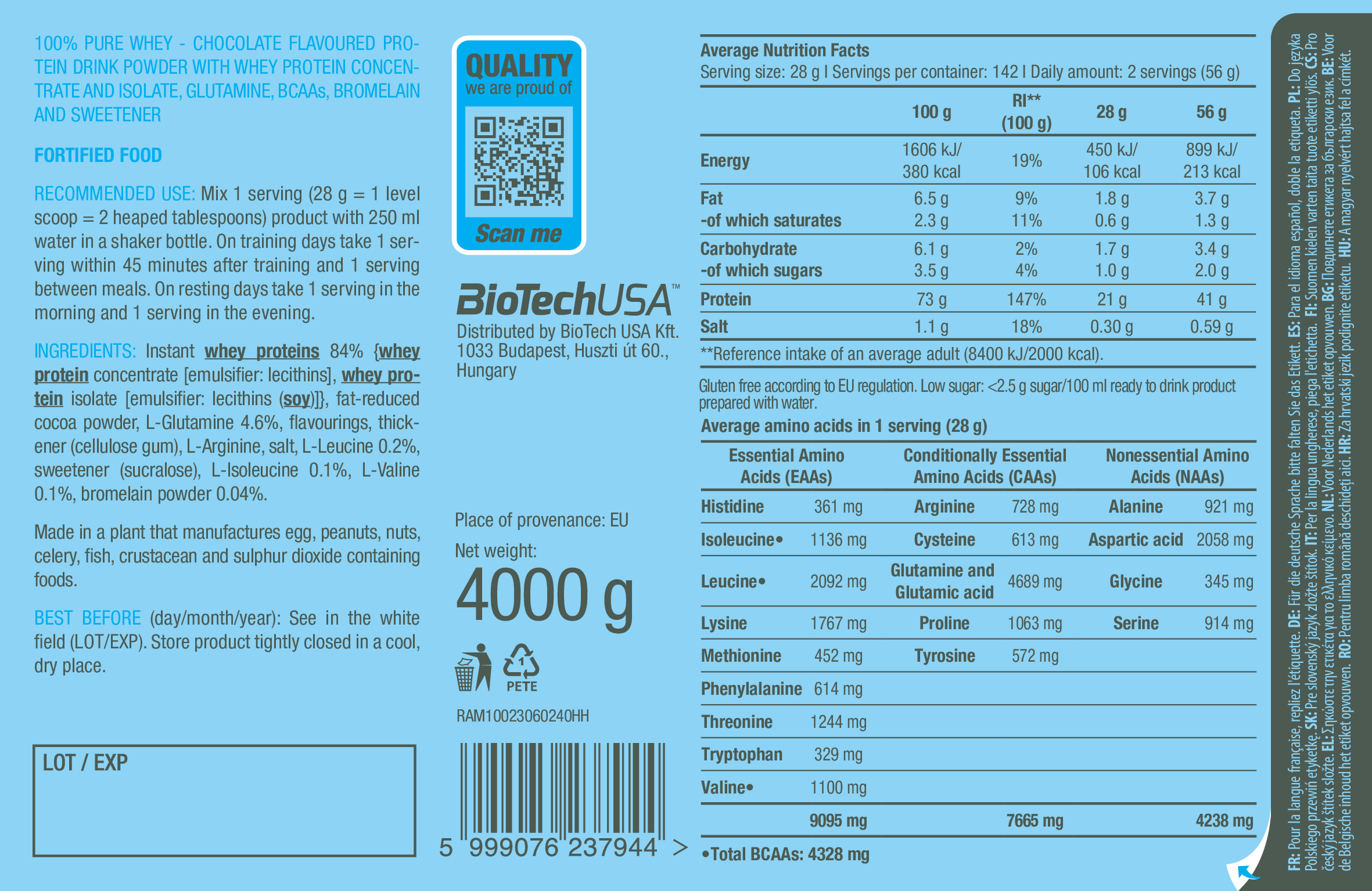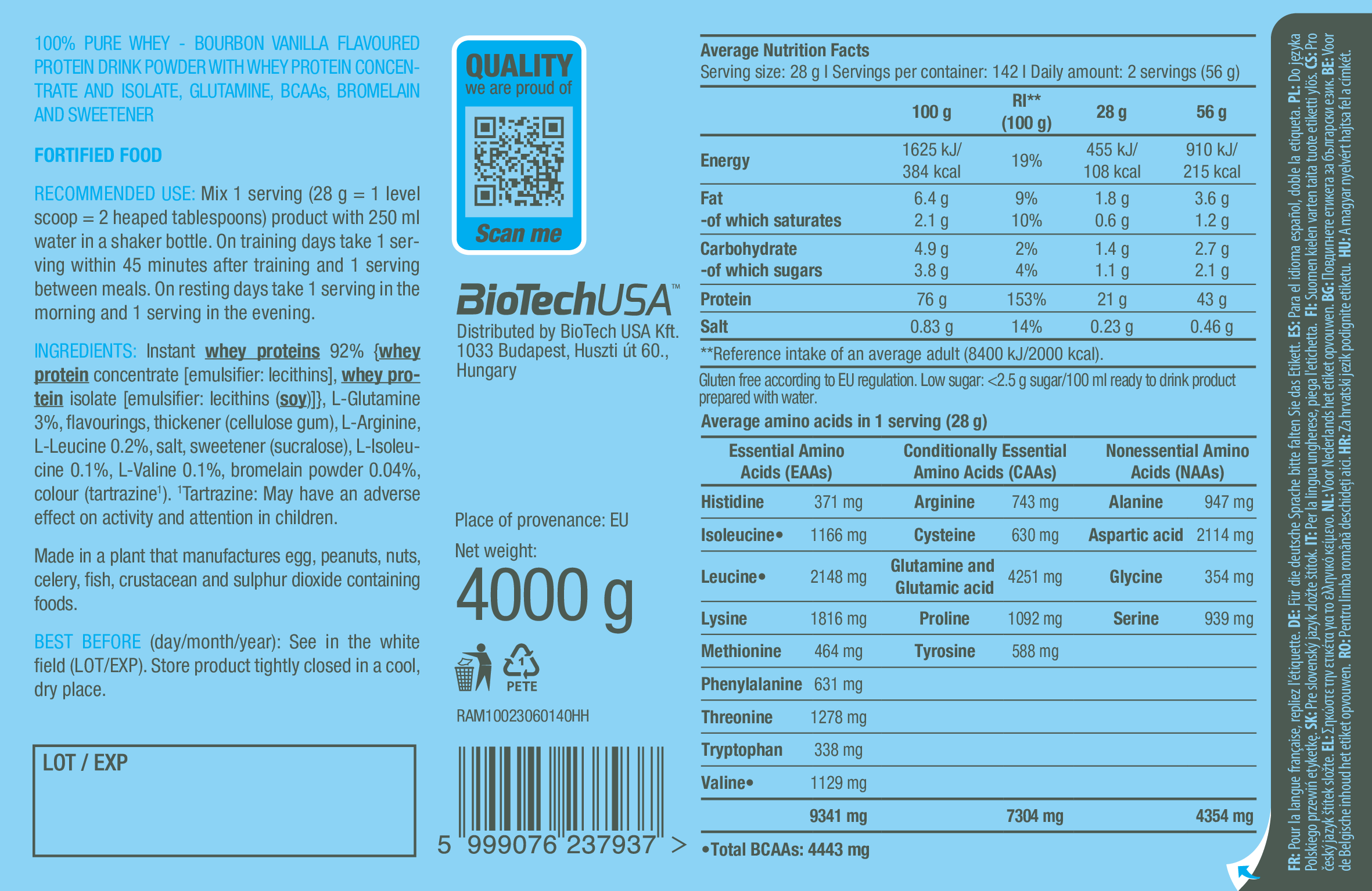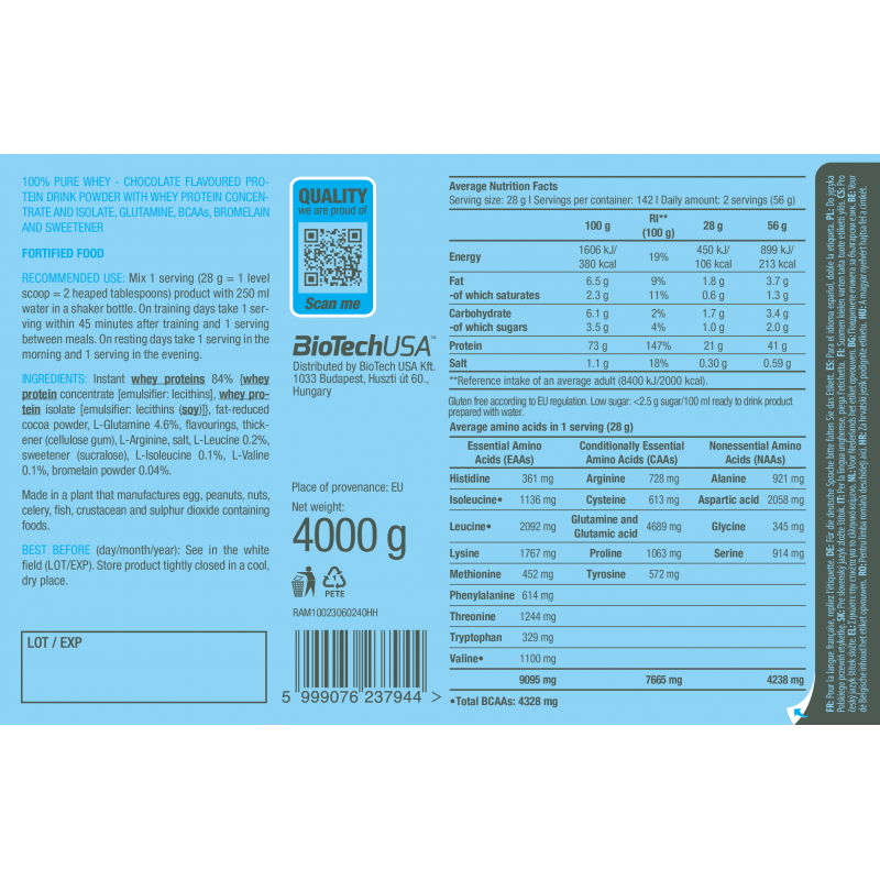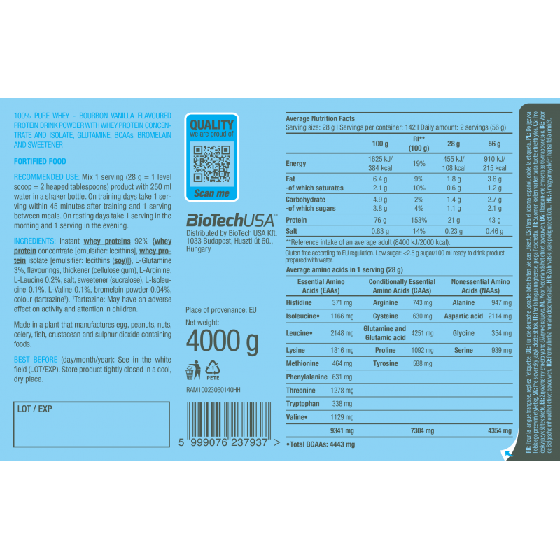 為您的肌肉提供高品質的營養,有助維持正常的肌肉功能與成長。100% Pure Whey由乳清濃縮物、乳清分離物及添加氨基酸(L-谷氨酰胺、L-精氨酸與 BCAA)組成,提供高生物價值與卓越的營養支持。與所有 BioTechUSA 產品一樣,100% Pure Whey 僅由安全且精心挑選的成分製成,確保您獲得最好的品質。