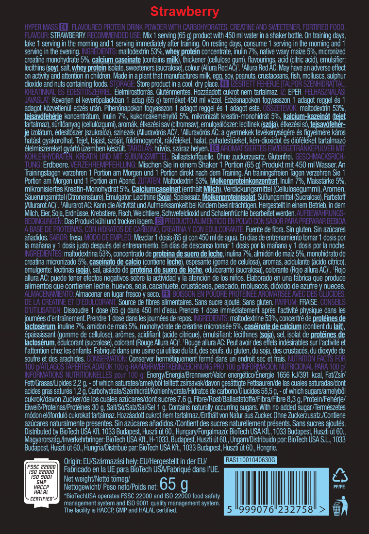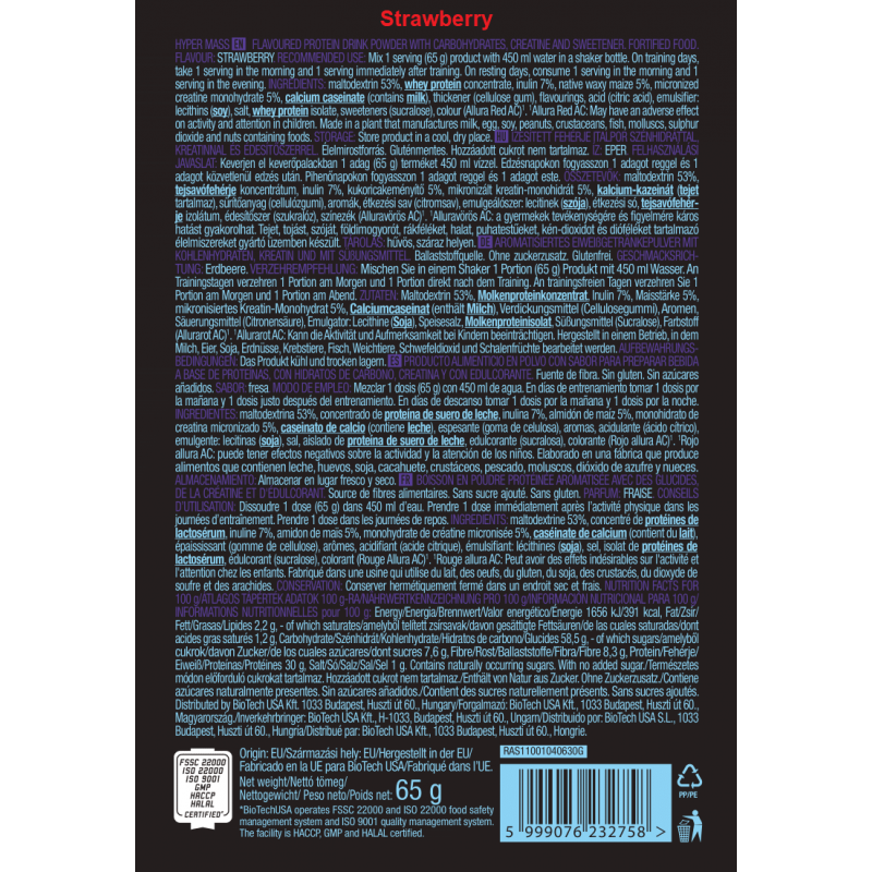 BioTechUSA Hyper Mass 是一款專為運動員、健美人士以及希望提升肌肉大小與力量的人士而設的增重粉。它精心搭配了碳水化合物、蛋白質、膳食纖維以及微粉化一水肌酸,為身體提供增長與恢復所需的額外熱量與營養。